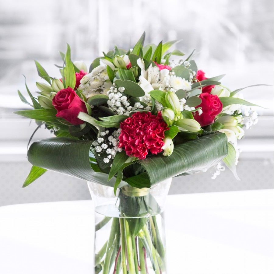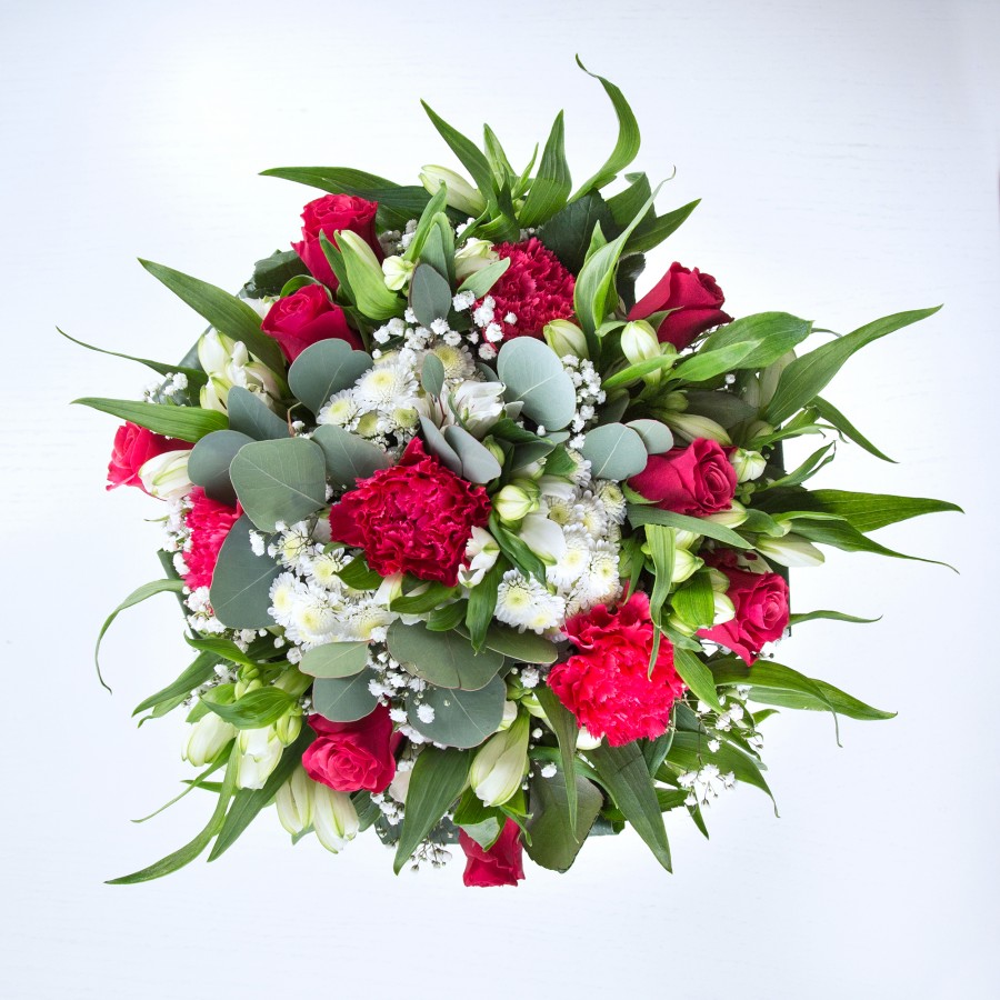 Our vibrant bouquet combines the timeless elegance of red roses with the purity of white chrysanthemums. Enhanced with gypsophila, carnations, and lush aspidistra leaves for a truly captivating display.